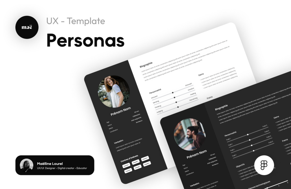 Our UX Personas Templates for Figma by Maë are designed to help you bring your target users to life. Each template includes dedicated sections for demographic details, needs, frustrations, goals and much more. Facilitate communication within your team by having a clear understanding of the personas that will influence your design. ✨